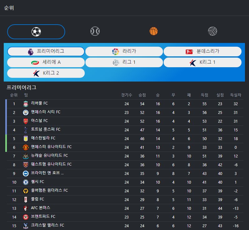 블루TV도 로그인 하지 않고 스트리밍 서비스로 경기를 볼 수 있습니다. 특히 EPL이나 프로야구, 프로농구, 프로배구 경기를 바로 볼 수 있고 팀 순위까지 제공합니다.